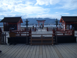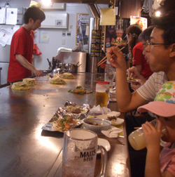 | 安芸の宮島・・・日本三景として知られる「安芸の宮島」、瀬戸内海に浮かぶ島、朱塗りの社殿を海に浮かべた世界遺産・厳島神社がそのシンボル、大鳥居が本社正面の海中にたち,楠の自然木を用いた4脚鳥居、干潮時で今回はたまたま足元まで行けたが、もう一度満潮時に海の上にそびえる姿を見たいものです・ | 広島風お好み焼き屋台村・・・ ビルの一角に十数件のお好み焼き屋 がある、一番売り上げの多い店に入る。隣にかわいい子供連れの親子が、まさに広島の食文化になっているようです | ||