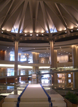 | 宿泊先広島プリンスホテル・・・海に面してロケーションのすばらしいホテル 1階ロビーが吹き抜けで、水に浮かんだチャペルとなっている最近の傾向でしょう、オープンな式場とかねています。 |