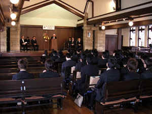 | □2008/3/15 来年の授業に備え講師会議・・・ 本年度の総括並び来年度のカリュキュラムについての打合せ。写真は本年度の卒業式式場はフランクロイドライト設計の池袋「明日館」 |