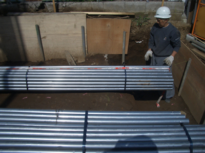 □2008/4/2 習志野市S邸・・・地盤改良工事RES-P工法鋼管を308本、7mの深さまで貫入させる。鋼材の受け入れ検査、工事の立合い |