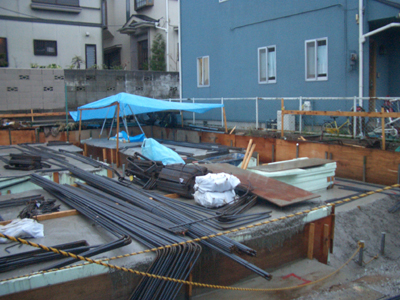 □2008/4/10 習志野市S邸・・・現場定例会議、基礎配筋工事も今日の雨で打ち切り。 |