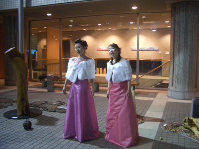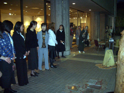 □2008/4/14 建築美術工芸協会の卯月展(女性作家11人による作品展) オ-プニングパ−ティ-・・・私は、企画協力で参加、テーマを「和の空間」とし、桂離宮の延段を例に「真・行・草」の空間を提案、プロの声楽家による、イヴェントもあり盛況なオープニングでした。 |