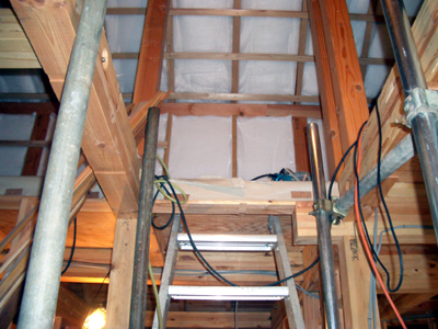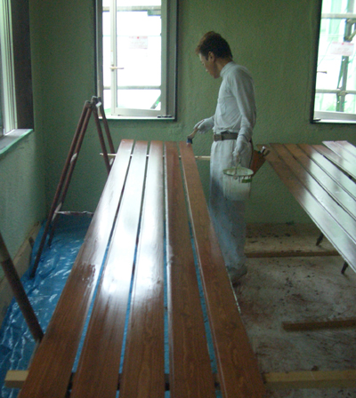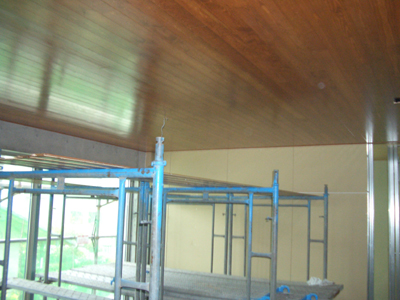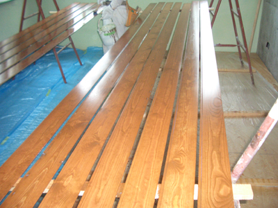 | □2008/9 習志野市S邸・・・天井材、松の無垢材を乾燥させたものを現場でオイルステンで色だし、素材の良さを最大限に引き出すため、試行錯誤した仕上げ、2階床部分の仕上げも進む。 | ||||||