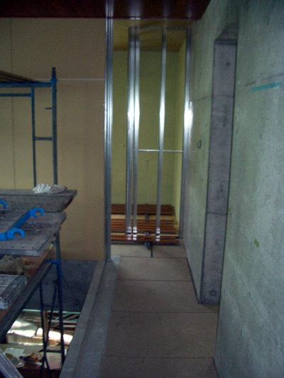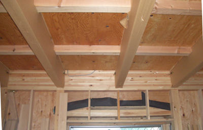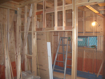 | □2008/9 三鷹市M邸・・・木工事もだいぶ進む、 写真は、居間の化粧梁、仕上げの色を検討。 次の写真は階段部分レベル差があるため 納まりの検討。次ぎの写真はキッチン部分 工事が進んでくるとワクワクする。 |