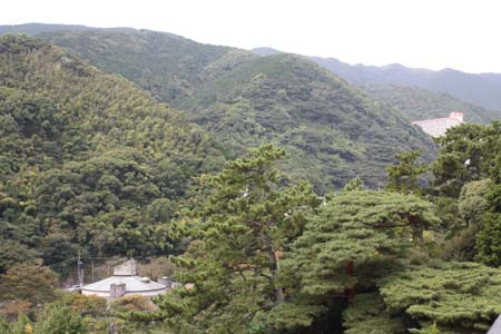 休暇で熱海温泉へ・・・宿の入り口・夕陽の山々・中庭と露天風呂