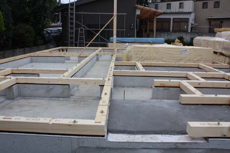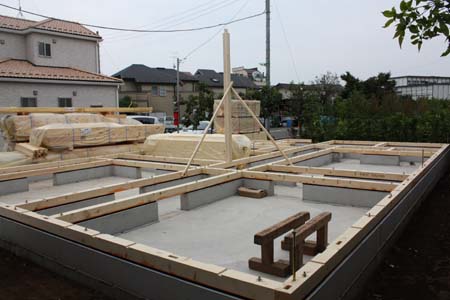 三鷹市A邸・・・基礎工事も完了本日土台敷き、連休明け上等予定形式だけれども、柱を立てている。 |