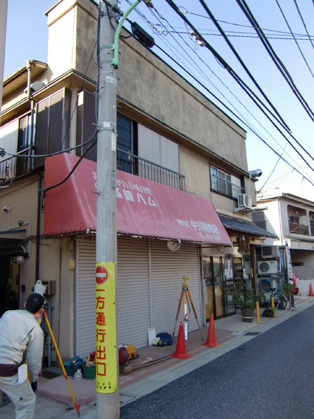 | 2010/12/9 世田谷区烏山H邸・・・ちょっと変わった仕事の依頼があり、今日はその測量の立会いで出かけました。左の写真の建物を分割して左側半分を撤去することになりました。 今後左側の方と交渉し、依頼先方である右側の家の保全を検討するという仕事です |