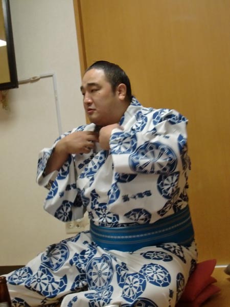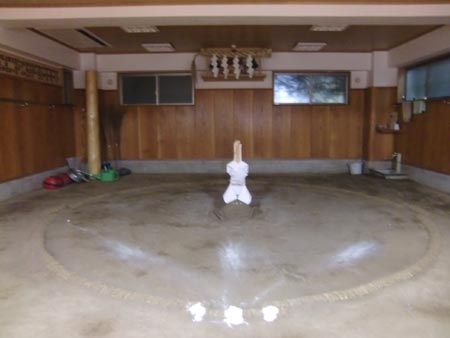 | 2010/12/21 江東区毛利相撲の伊勢ヶ浜部屋でちゃんこ鍋を食べる・・・写真左から伊勢ヶ浜部屋玄関・正面土俵・伊勢ヶ浜親方(元横綱旭富士)・安美錦関 |