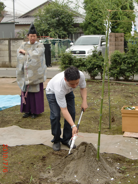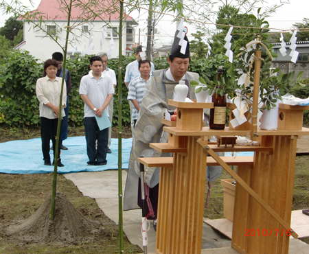 | 2010/7/6 三鷹T邸地鎮祭・・・本日は地鎮祭、お施主さん・ご両親、神主さんのご祈祷・鍬入れの儀、 工事の無事を祈りました。 |