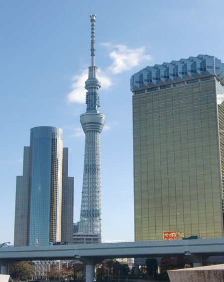 | 2011/11/25 日加(カナダ)協会主宰による「スカイツリーを眺めながらの隅田川沿い歴史散策」でスカイツリーの講師を勤める。 ・・・スタートの浅草吾妻橋のたもとから隅田川越しに東京スカイツリー望む。右の建物はアサヒビール本社 |