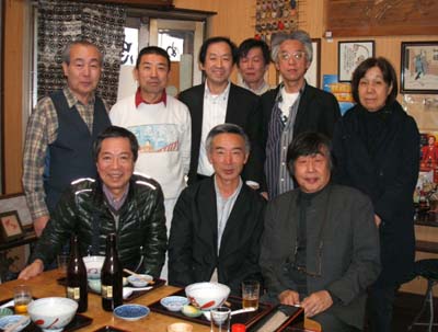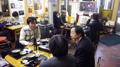 | 2011/11/5 映画「津軽百年食堂」・・・津軽に百年続く大衆食堂を舞台とした心温まる家族愛を描いた感動の人間物語、そのモデルとなった三忠食堂で、津軽そば(そばがきを一晩水で冷やし、小麦粉の代わりに大豆の粉をつなぎにしてそばを打つ、津軽に伝わるあったかいそば)を味わいながら、シンポの成功祝いで小嶋先生・橋本先生を交え乾杯!! |