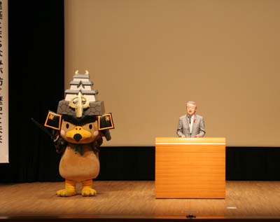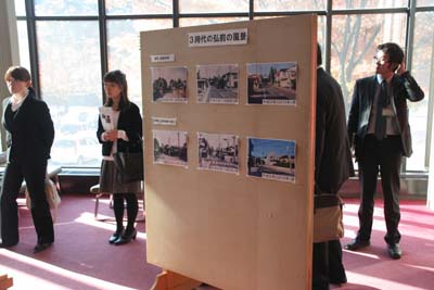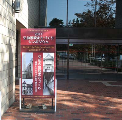2011/11/4 2011弘前景観まちづくりシンポジウム開催・・・弘前文化センターで入口の大きな看板、ホール内で弘前市の歴史写真の展示があり、観客の方々が熱心に弘前市の変遷を見ていた。小笠原副市長の挨拶が始まり、タカ丸君の登場で会場が大いに沸いた。 |