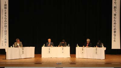 2011/11/4 パネルディスカッション・・・北原啓司先生(弘前大学教授)のコーディネーターによる討論会を開催、左より北原先生・小島先生・橋本所長(前川建築設計事務所)・松隈先生(京都工芸繊維大学教授)・北原尚子さん(弘前大学大学院生)テーマは、「弘前の景観を守り、創り、育むために必要なこと」活発な意見が交わされました。 |
