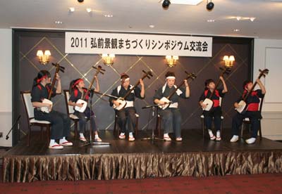 | 2011/11/4 交流会・・・多田あつし門下生の津軽三味線の演奏、子供の演奏家もいて弘前の文化を堪能しました。 |