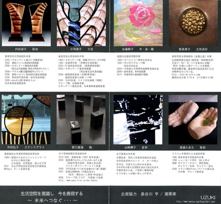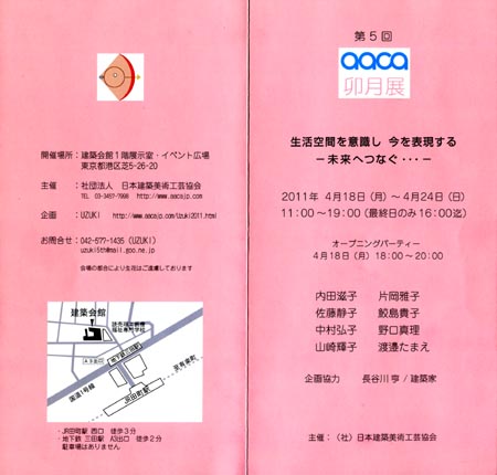 | 2011 2/2 aaca卯月展・・・今年で5回目最終展示となる卯月展の打合せ、三田の建築会館で開催。 (社)日本建築美術工芸協会では、来る4月4日(月)から10日(日)まで、 aacaの女性会員有志による第5回卯月展を開催いたします。本年は「生活空間を意識し 今を表現する−未来へつなぐ・・・−」をテーマにして 、8人の作家が、展示室とイベント広場を独創的に演出します。 企画で長谷川が今年も担当是非進化した舞台をご覧下さい。 |