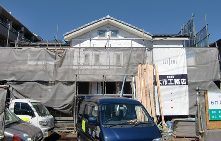 | 2011 3/5 調布市I邸・・・くっきり晴れ渡った晴天の日、調布の現場打合せに行く、パース(完成予想図)を持参、外壁・内装の色あわせ、職人さんと細かい打合せをする。 |