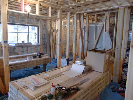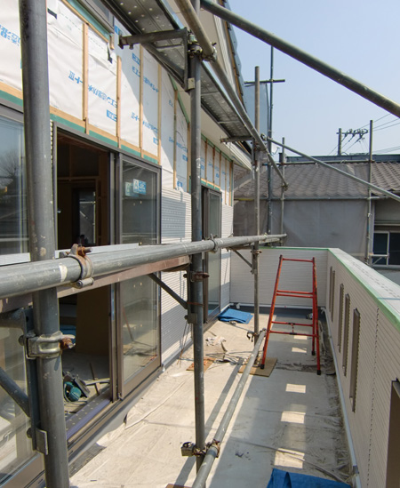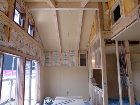 | 2011 3/30 調布市I邸・・・鉄骨屋外階段詳細について打合せ、外壁の材料も震災の影響で滞っていたがようやく再開できるようになった。 内装工事も進み写真は2階の居間吹き抜けとなっている。 |