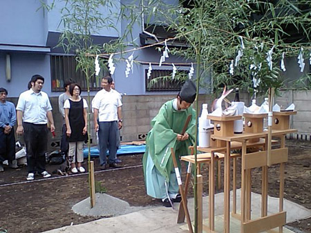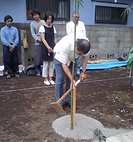2011.8/4 三鷹市E邸・・・本日は地鎮祭お施主さんの趣味が釣りでその成果の見事な鯛が祭壇に供えられました。右の写真はお施主さんの鍬入れの儀。 |