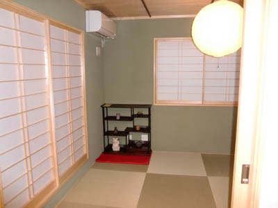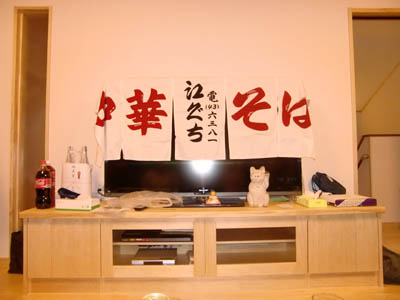 左がお施主さん、右が同じ剣道7段、釣り仲間で、仕事も同じ教頭先生。 | お施主さんのお父さんは三鷹駅前でも有名なラーメン屋さん、その暖簾と招き猫を披露していただきました。 | 和室のなかにお父さんより引きついだ飾り棚その下の毛氈が、ひときわ目を引くしつらえでした。 |