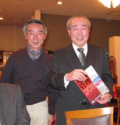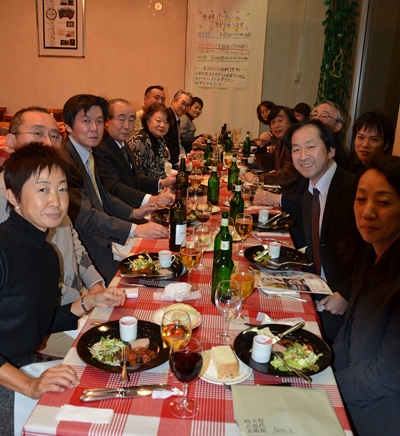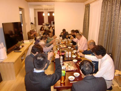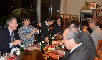 | 2012/1/26 2011弘前景観まちづくりシンポジウム懇親会・・・昨年11月3日・4日に開かれました「2011弘前景観まちづくりシンポジウム」に出かけたメンバーが集まり懇親会を開きました。 左から16名参加、ワインを片手に懇談、橋本先生、右は小嶋先生と小林さん |