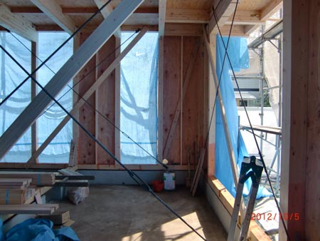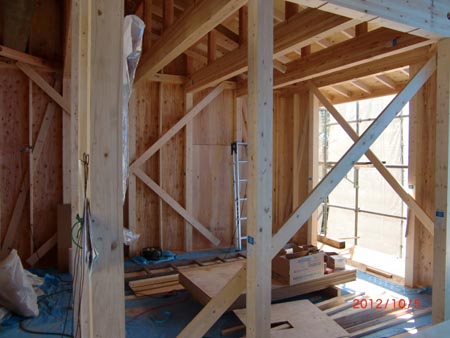 | 2012/10/5 三鷹市S邸・・・上棟も無事終了構造部分土台・柱・梁・筋違の工事 |