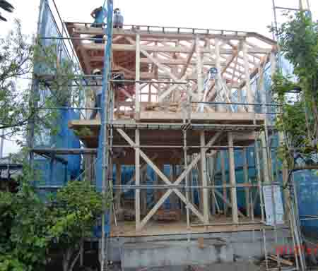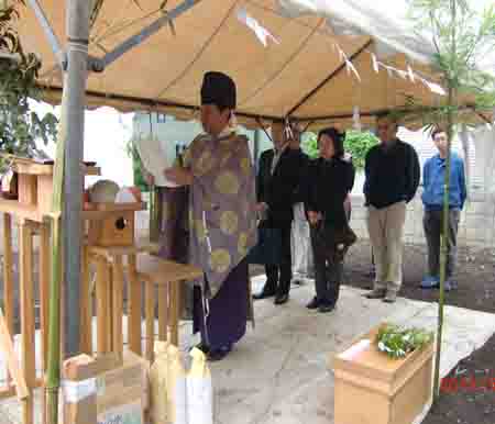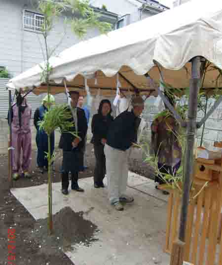 2012/5/22 三鷹市Nコートハウス新築工事・・・地鎮祭を執り行う。あいにくの雨であったがテントを用意無事終了。 |