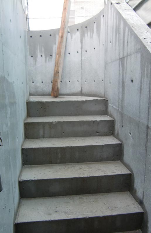 11/24 K邸共同住宅・・・本日は定例会議、3階の建て込み、外階段の型枠もはずれ形が出てきた。 |