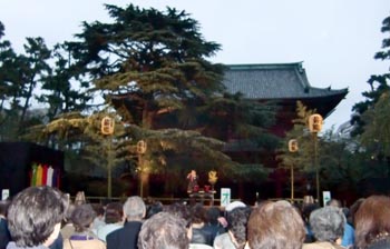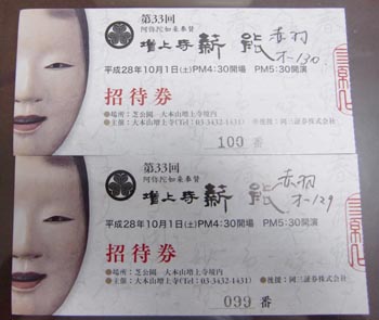 | 10/1(土) 日加協会の会員 梅若様の薪能を観賞する。・・・芝増上寺の境内において、宵闇の迫ったころ悠然とした世界が演じられる。 日加協会でお世話になっている梅若様の能の舞を拝見いたしました。途中雨で少々早く切り上げられました。 |