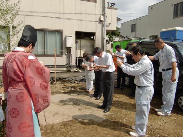 | 7/22(土)Sビル新築工事・・・地鎮祭をお願いしている「武蔵野八幡神社」を参拝。延暦8年、桓武天皇の時代に創建された歴史ある神社さんです。 | 7/28(金)Sビル新築工事地鎮祭・・・陽射しの強い日ですが、工事の無事を祈願してお祈りと乾杯。 | ||||||||||