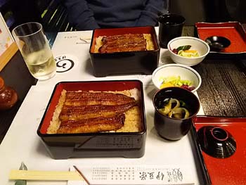 11/7(水) 上野公園内で「青森人の祭典」の催しを見てきました。コンサートや地元の名産品特産品販売などがあり盛況でした。 | 11/7(水) 上野不忍池近くの鰻料理の老舗 「伊豆榮」でうな重をいただく。伊豆榮は江戸時代中頃からの鰻割烹です。 お店の紹介文に「当時の蒲焼屋というものは、大てい葭簀(よしず)張りか小屋掛け程度で、代々の言い伝えによりますと、当店も徳川八代将軍吉宗公の頃に、町中のささやかな商いから始まったと言うことです。」とありますが、今では、稚魚が少なくなり贅沢なお料理です。 |