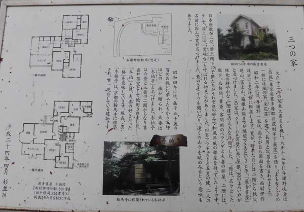 | 4月24日(水)杉並区H邸改修工事外壁屋根の調査に出かける。 | 4月24日(水)杉並区H邸改修工事現調の途中与謝野公園あり足を止める。与謝野鉄幹・晶子夫妻が関東大震災を機に翌1924年に移り住み、晩年を過ごした旧居があった場所に整備された公園。当時の間取り図と写真も解説があり建築価値としても興味深いものがある。 | ||||||||||||||
